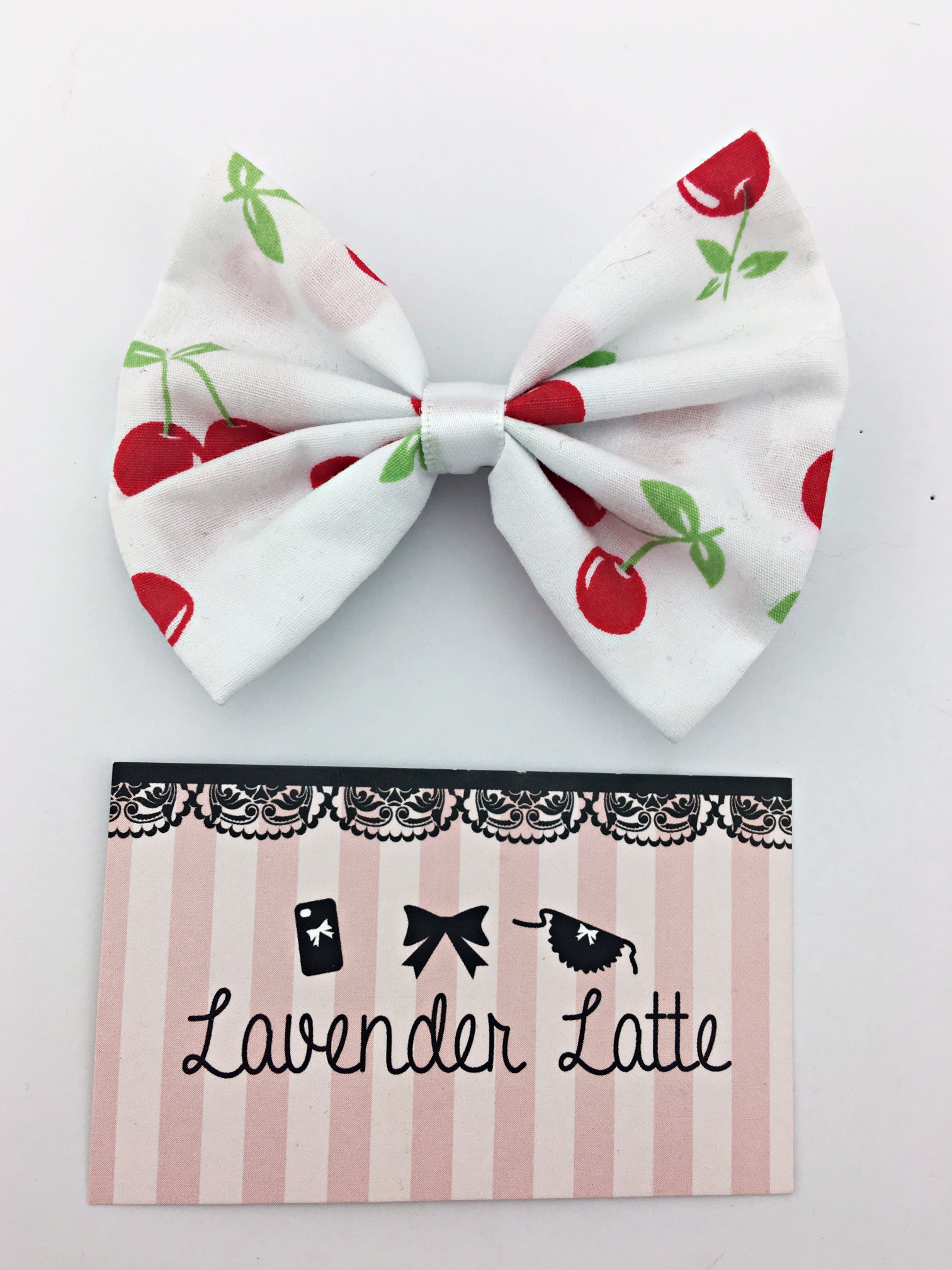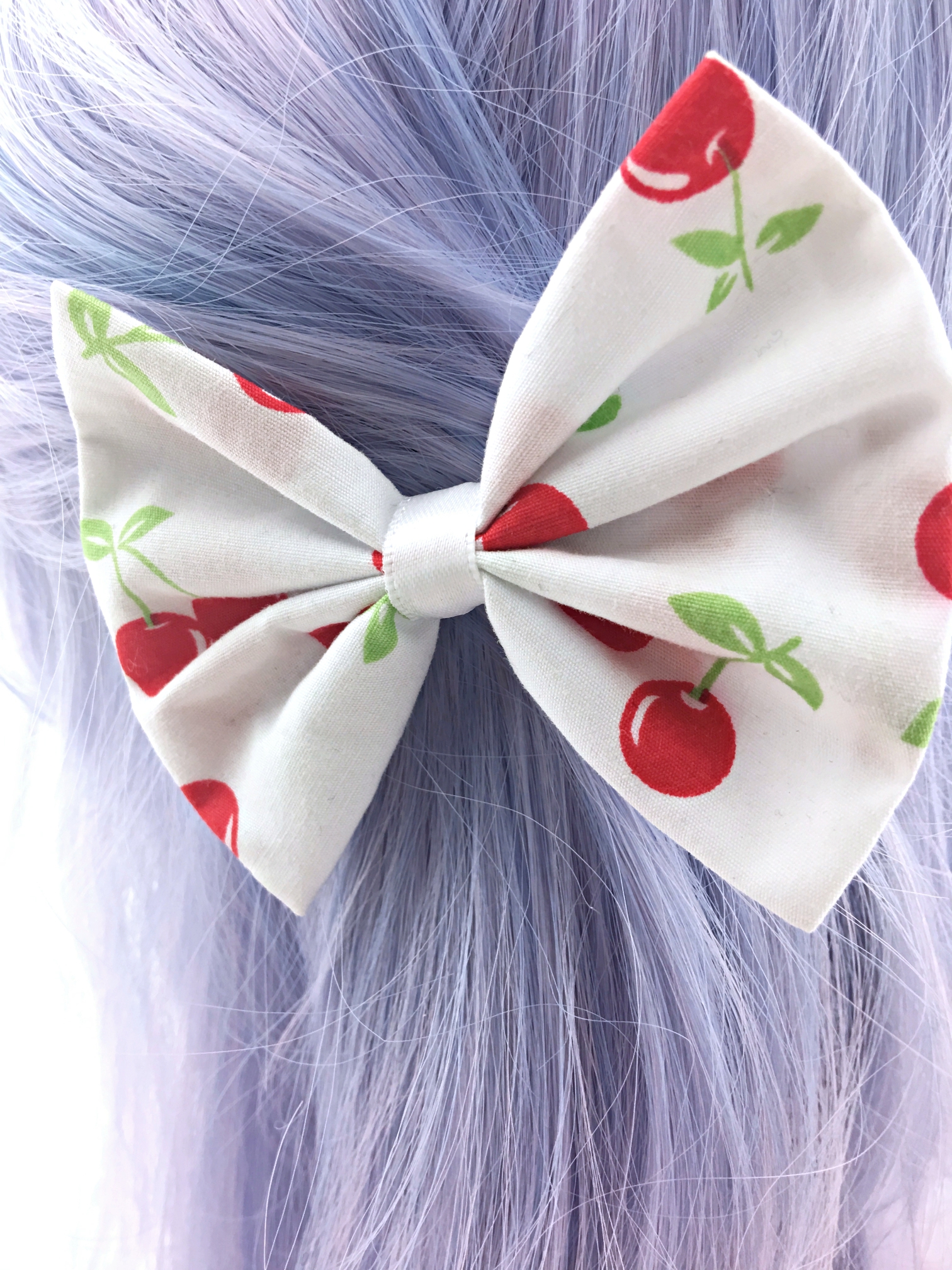 Cherry Print on White Fabric Hair Bow - Pin Up Rockabilly Hair Clip