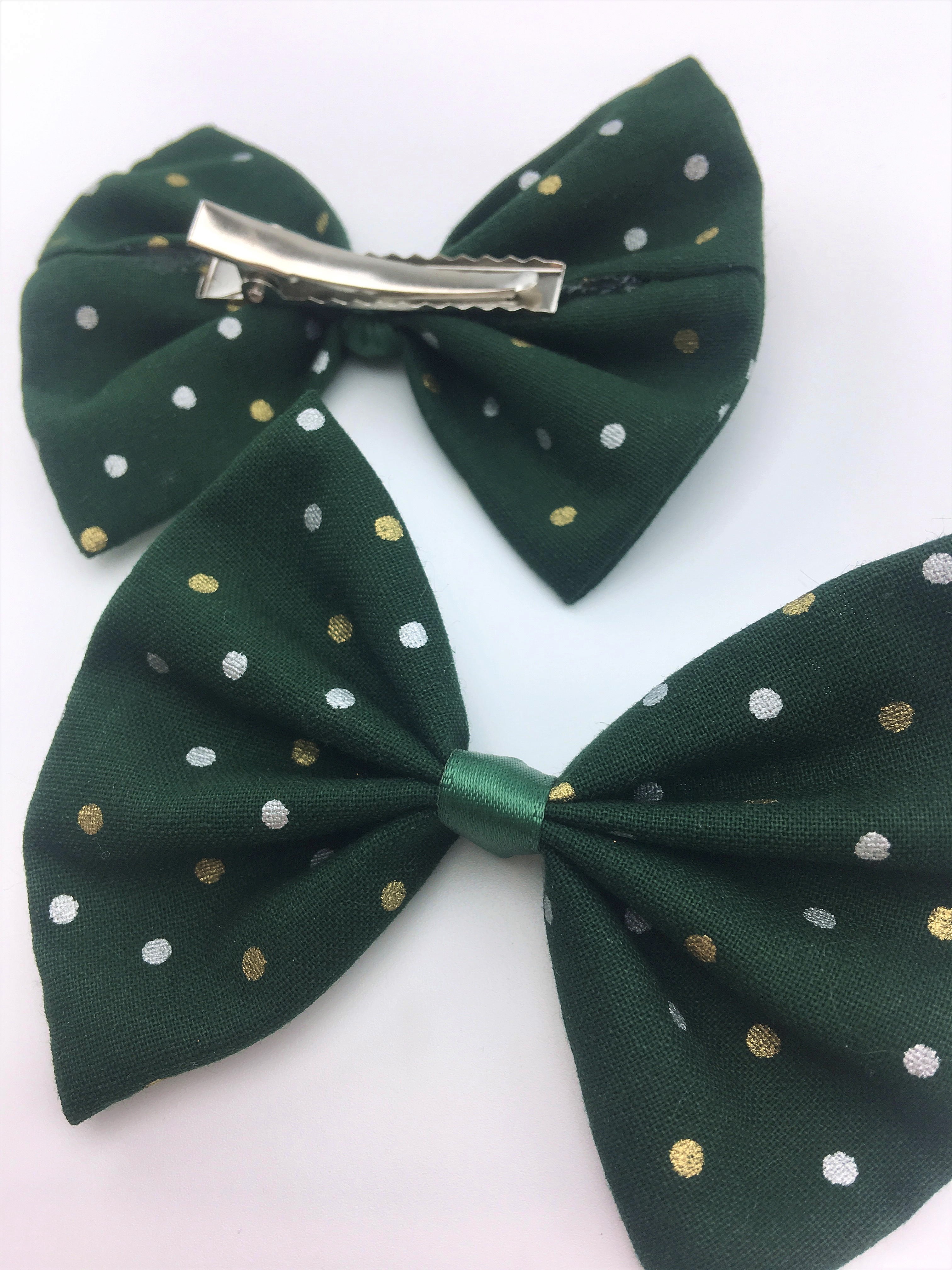 Deep Green Christmas Metallic Polka Dot Print Fabric Medium Hair Bow with Gold and Silver Metallic Detail