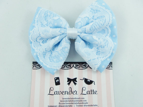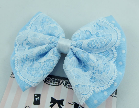 Baby Blue Pastel Polkadot Hair Bow with Delicate White Lace Overlay -- Vintage Insprired Hair Clip